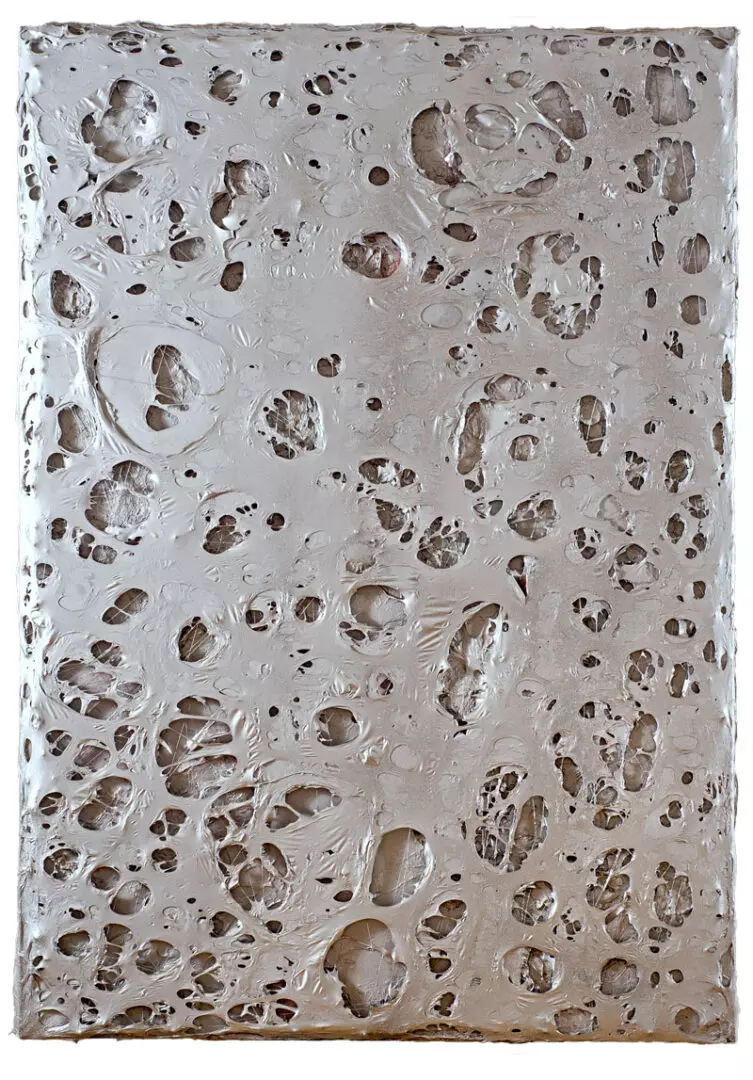 Opere tra il 1955 e il 1959. Al colore classico si aggiungono materiali plastici, come il cellophane che vengono combusti su tela. È il trionfo della materia bruta. Si cancella ogni segno lineare, nessun controllo razionale. Usa colori accesi, verdi, azzurri, rossi, in quanto qualità prime della materia, ma anche argenti, bianchi e neri. Espone per la prima volta le "Plastiche" alla Biennale di Venezia nel 1956, nella sala 29. Spesso i suoi nuclei li inquadra in passepartout, realizzati come feritoie da cui studiare il soggetto.